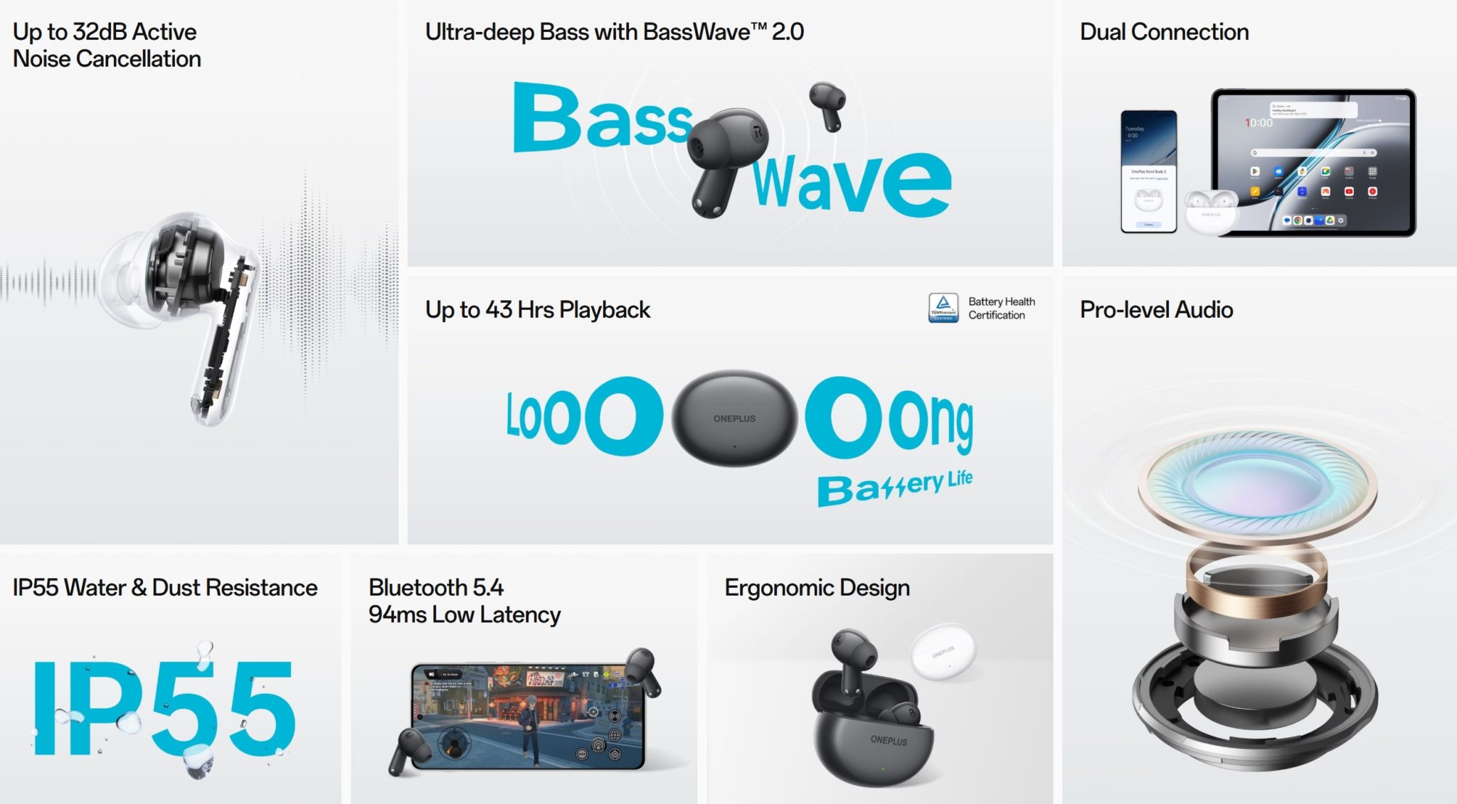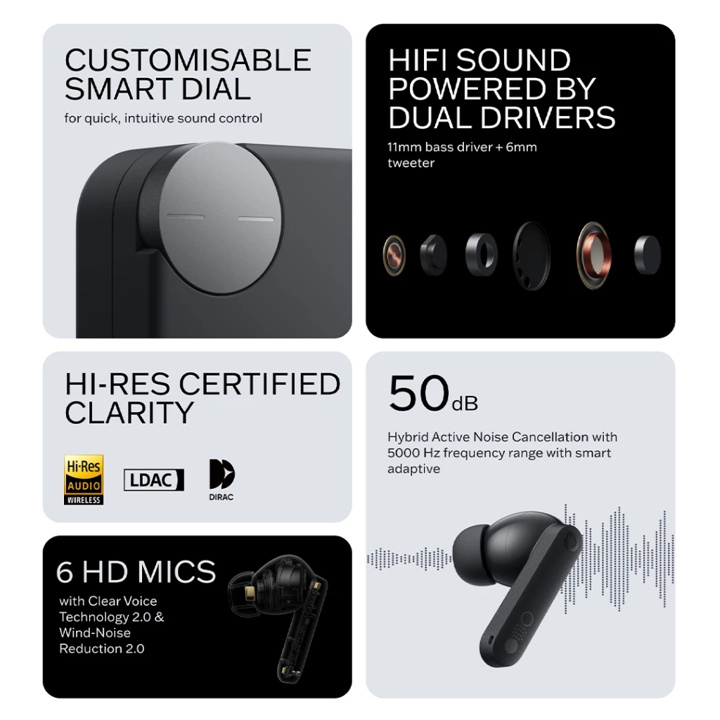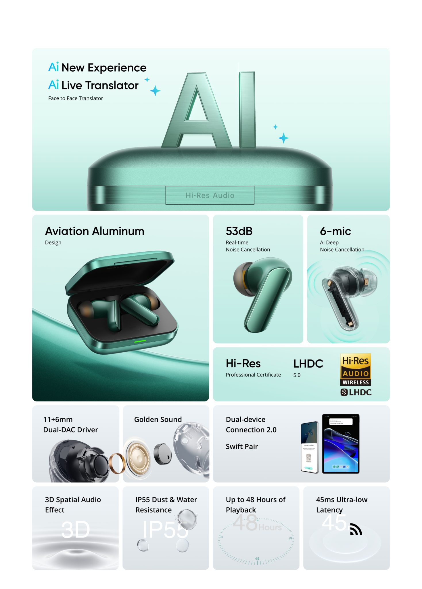 Untuk audio mantap, ia dilengkapi pemacu 12.4mm dan sokongan ANC sehingga 32dB serta 4 mikrofon dengan AI noise cancellation untuk panggilan jelas.
