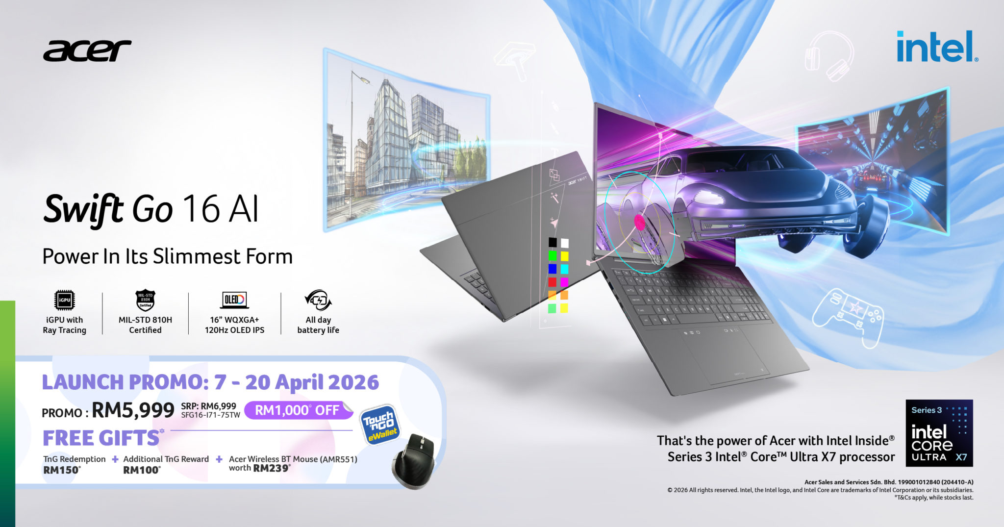 Pra tempahan sudah pun dibuka, komputer riba Swift Edge 14 AI ditawar pada harga bermula RM5,899, manakala Swift Go 16 AI pula berharga RM6,999.