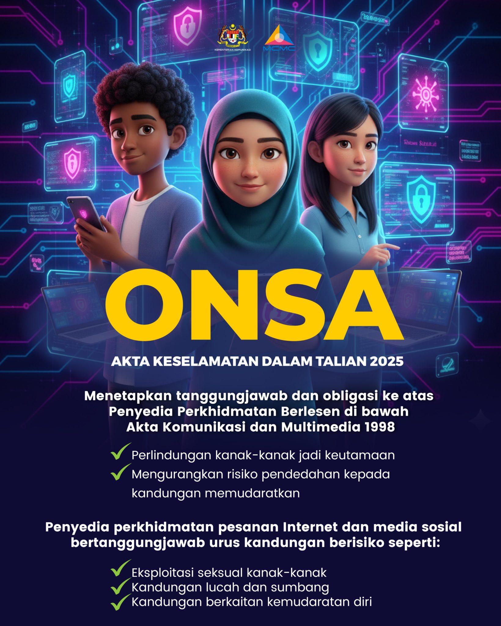 Penguatkuasaan Akta Keselamatan Dalam Talian 2025 (ONSA) memperkukuh perlindungan pengguna, khususnya kanak-kanak dan keluarga, dengan memastikan platform digital memikul tanggungjawab yang sewajarnya. pic.twitter.com/LXgsbgm5qo