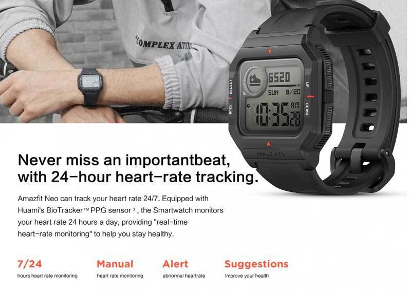 Amazfit Neo dilengkapi dengan sensor BioTracker PPG3 untuk memantau kadar degupan jantung 24/7 dan juga memberi amaran jika degupan jantung menjadi laju.