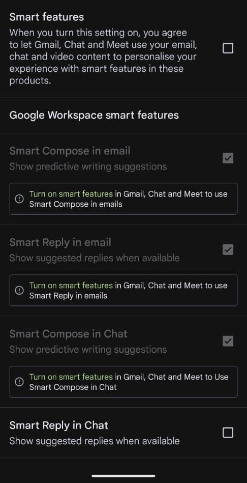 “Apabila anda menghidupkan ciri pintar dalam Gmail, Chat dan Meet, anda bersetuju untuk membenarkan Gmail, Chat dan Meet menggunakan kandungan dan aktiviti anda dalam produk ini untuk memperibadikan pengalaman anda dalam aplikasi tersebut.” Google