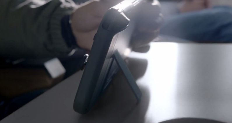 Model ini juga dihadirkan dengan tongkat pada bahagian belakang memudahkan anda meletakkan skrin diatas meja dan bermain bersama rakan ketika berada di luar.