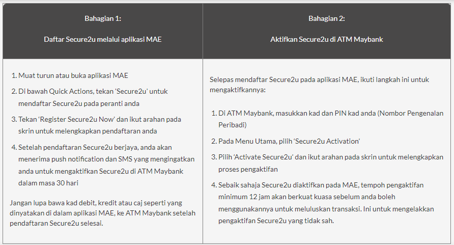 Lanjutan itu, pengguna yang belum memuat turun aplikasi MAE disarankan melakukannya secepat mungkin. Selain dilengkapi dengan semua fungsi Maybank2u MY, aplikasi MAE turut menawarkan sekuriti yang dipertingkatkan dengan Secure2u sebagai satu-satunya cara untuk mengesahkan transaksi.