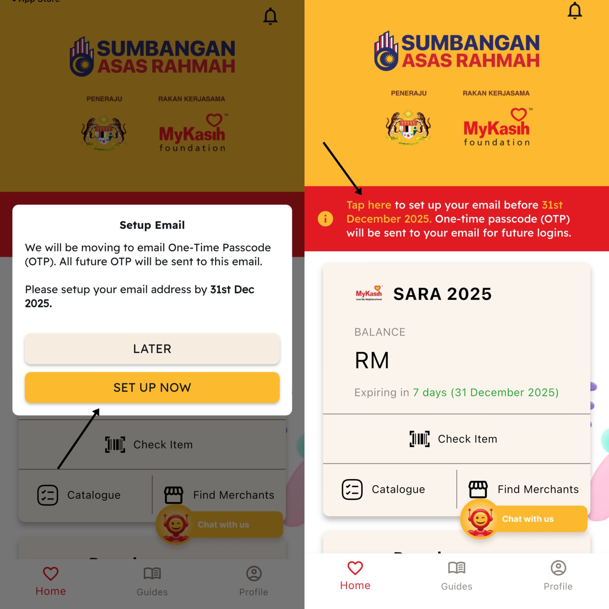 Sehubungan itu, penerima Sumbangan Asas Rahmah (SARA) yang menggunakan aplikasi MyKasih perlu mendaftarkan alamat e-mel sebelum 31 Disember 2025.