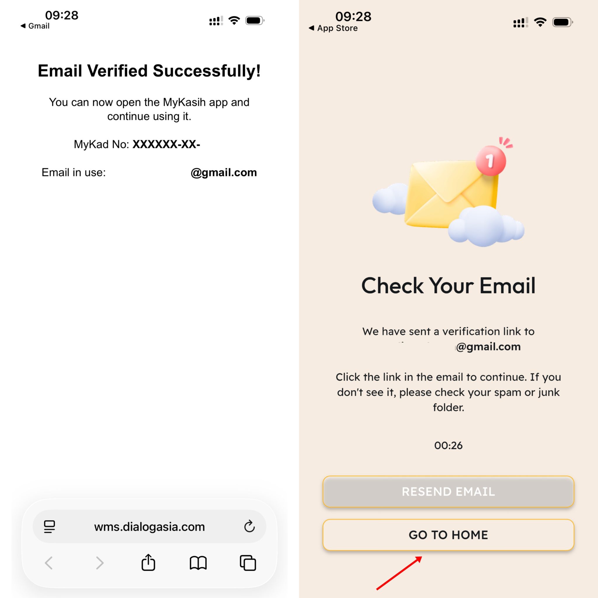 4. Setelah pengesahan berjaya, kembali ke aplikasi MyKasih dan klik “Go To Home”. Proses pendaftaran e-mel selesai.