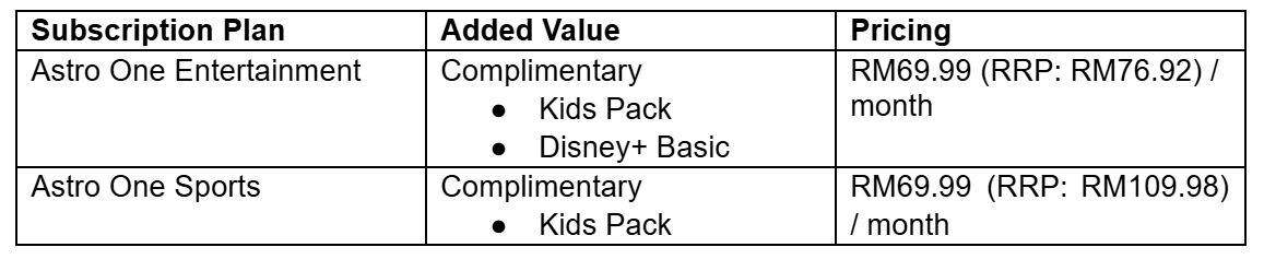 Astro One Entertainment hadir dengan Disney+ Basic serta Pek Kanak-Kanak percuma, manakala Astro One Sports turut disertakan Pek Kanak-Kanak percuma. Harga asal kedua-dua pelan disenaraikan pada RM76.92 dan RM109.98 sebulan.