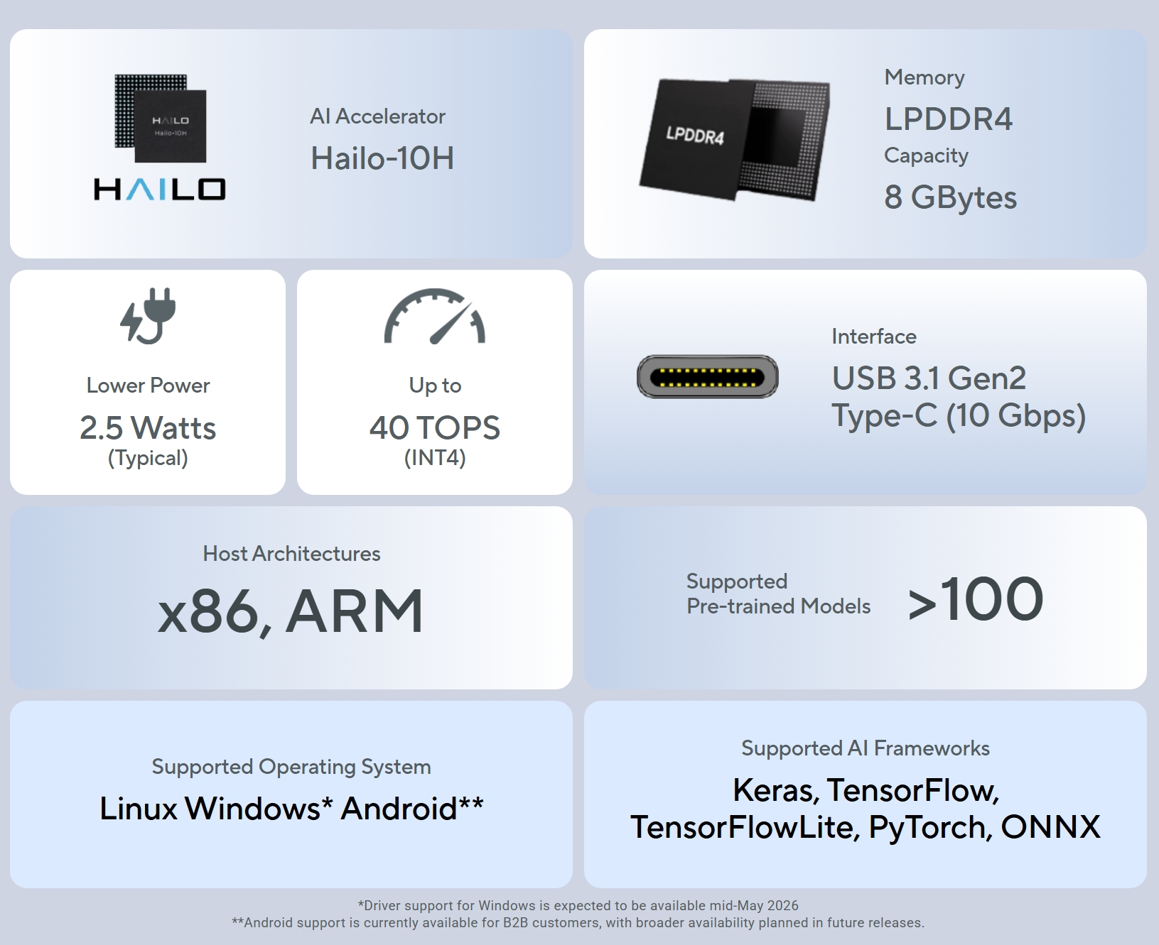Dikuasakan cip Hailo-10H dengan keupayaan sehingga 40 TOPS, ia mampu mengendalikan model bahasa besar (LLM), model visual (VLM), serta aplikasi AI moden seperti penjanaan teks, ringkasan video, dan arahan suara-ke-tindakan.
