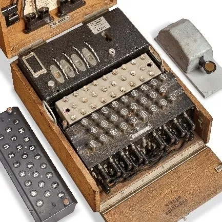 Berdasarkan sistem kekunci dan rotor kompleks, mesin Enigma digunakan oleh Jerman untuk komunikasi tersulit semasa perang di mana pada mulanya ia di luar kemampuan perisikan Pihak Berikat untuk memecahkannya.