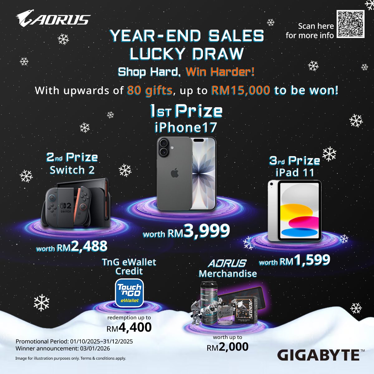 Rebut peluang ini sebelum berakhir pada 31 Disember 2025. Layari laman rasmi Year End Sales Promo|AORUS – GIGABYTE Malaysia bagi mengetahui lebih lanjut terma dan syarat.
