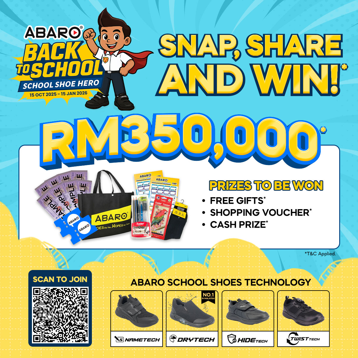 Kempen Back to School ABARO juga sedang berlangsung sehingga 15 Januari 2026 di mana sepanjang kempen ini, anda boleh mendapatkan kasut sekolah ABARO pada harga promosi.