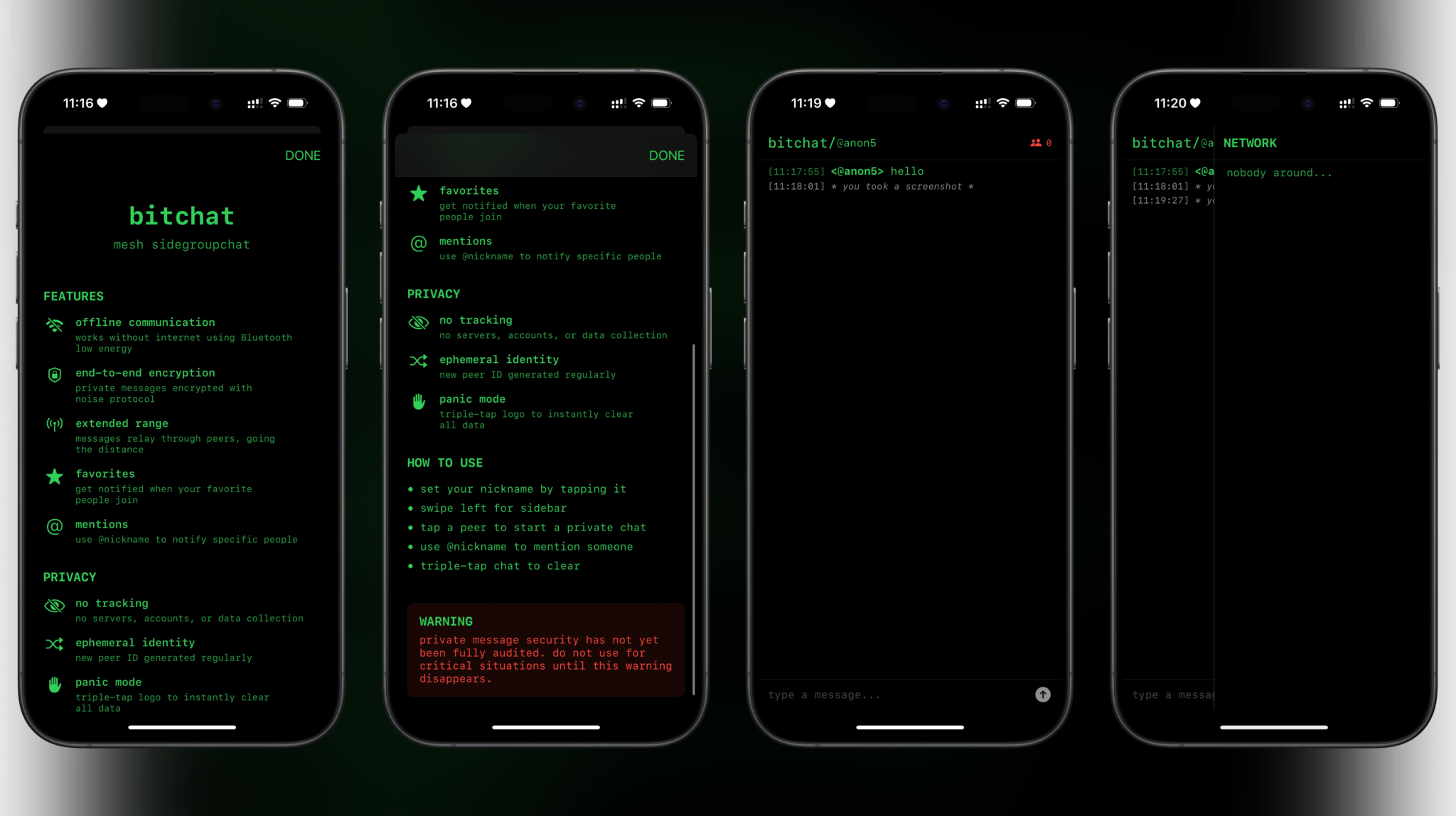 Dikenali sebagai bitchat mesh, ia merupakan aplikasi pemesejan peer-to-peer berasaskan Bluetooth dan tidak memerlukan sambungan internet. Ia turut dilengkapi sistem penyulitan hujung ke hujung.