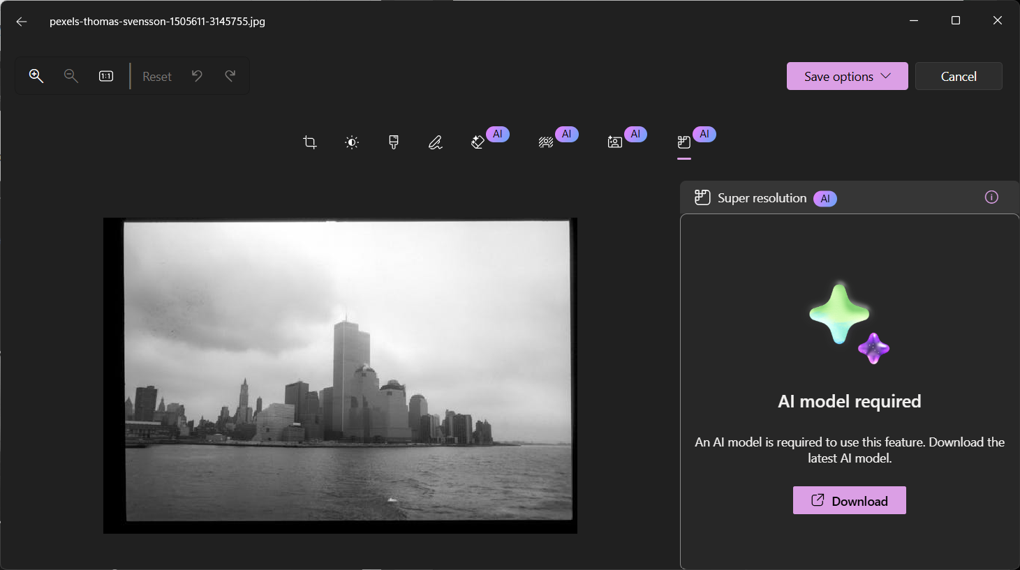 Selepas itu, untuk pertama kali guna, anda perlu memuat turun model AI bagi ciri Super resolution tersebut. Klik pada butang Download.