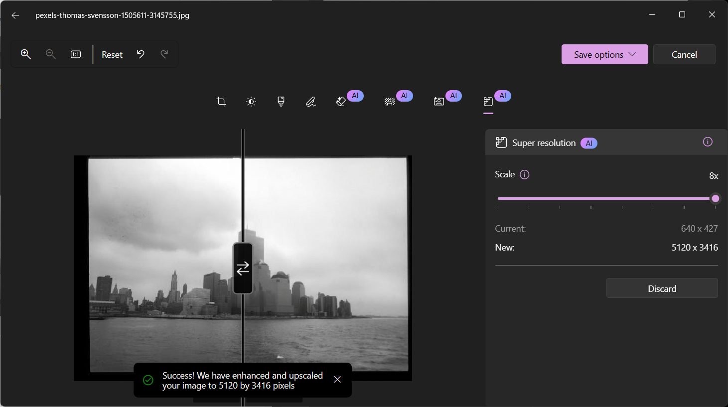 Pengguna boleh memilih tahap peningkatan sehingga 8x dan melihat perbandingan sebelum serta selepas suntingan.