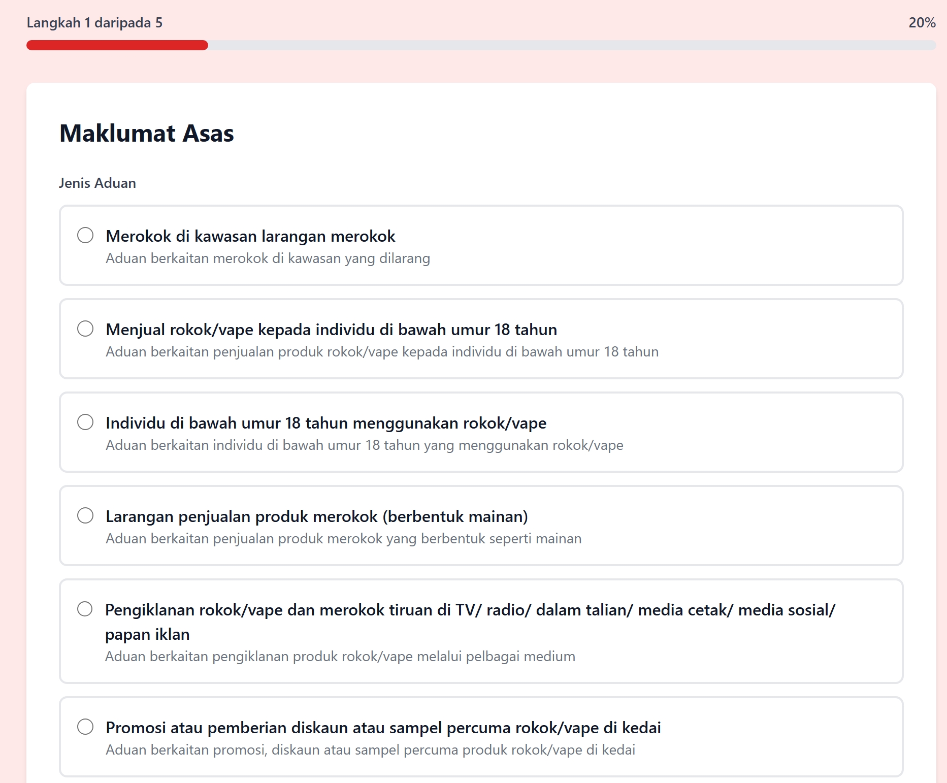 2. Di laman Jom Lapor, pada bahagian Maklumat Asas, terdapat beberapa pillihan laporan yang boleh dibuat berkaitan dengan rokok.