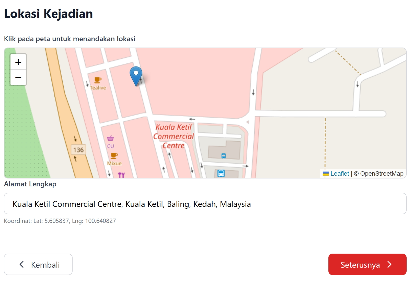 4. Di bahagian Lokasi Kejadian, masukkan Alamat Lengkap lokasi tersebut dan klik butang Seterusnya > setelah selesai.