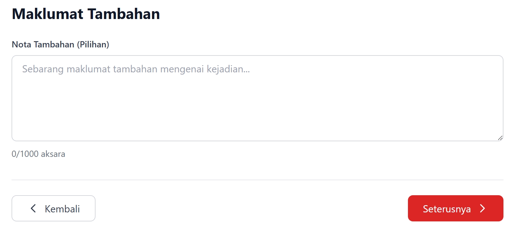 5. Selepas itu, anda di bawa ke laman Maklumat Tambahan. Di sini anda bolehlah buat karangan pendek berkaitan isu yang dilaporkan. Selesai, klik butang Seterusnya >.