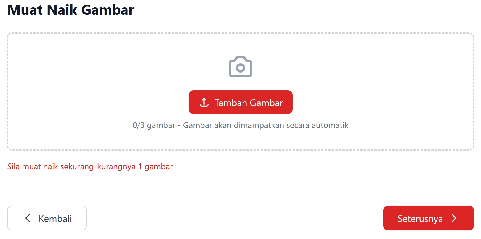 6. Langkah seterusnya, anda diminta untuk memuat naik foto sebagai bukti kejadian. Sekurang-kurangnya, 1 foto berkaitan laporan mesti dmiuat naik untuk membolehkan laporan dibuat. Anda boleh memuat naik sehingga 3 foto di sini.