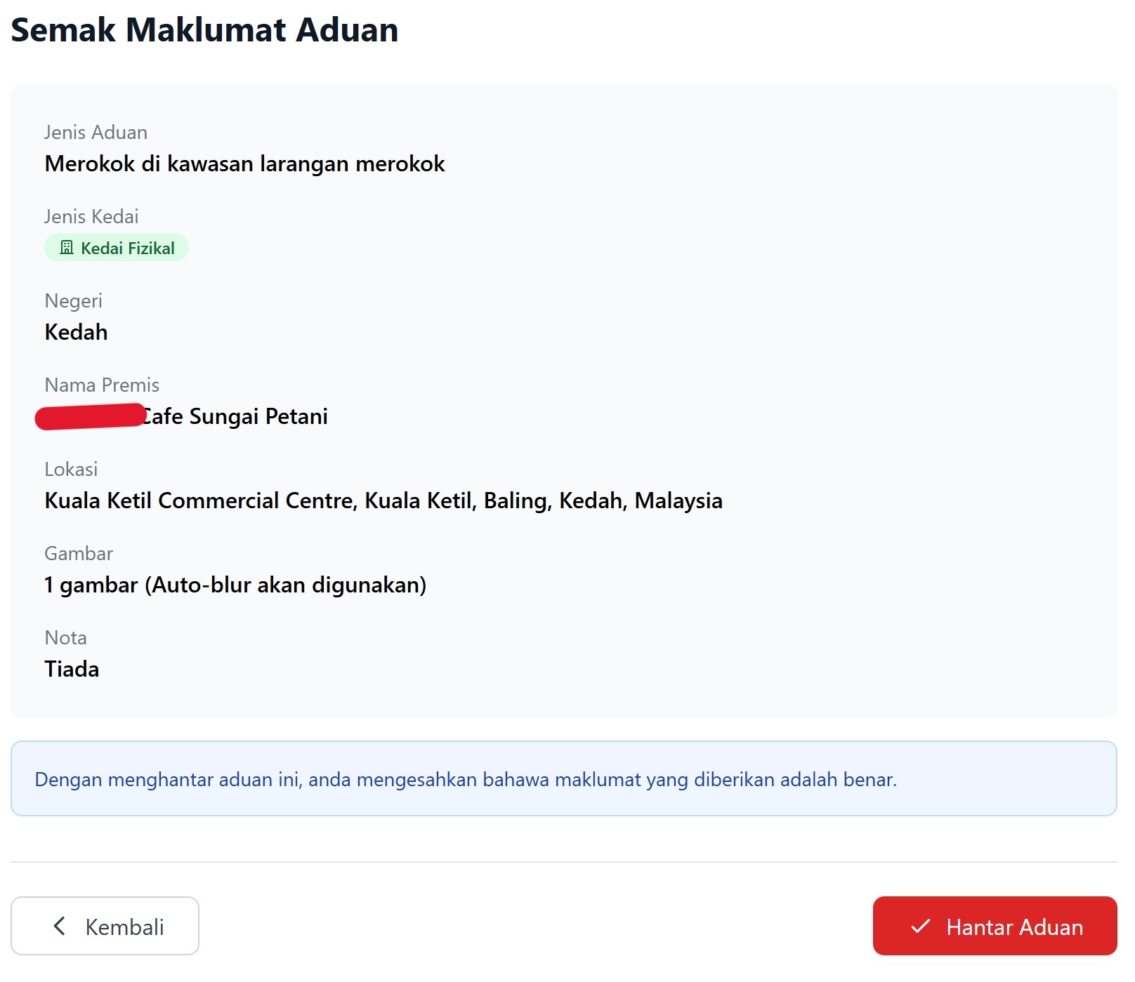 7. Akhir sekali, anda semak terlebih dahulu laporan yang ingin dibuat sebelum menghantarnya dengan menekan butang Hantar Aduan.