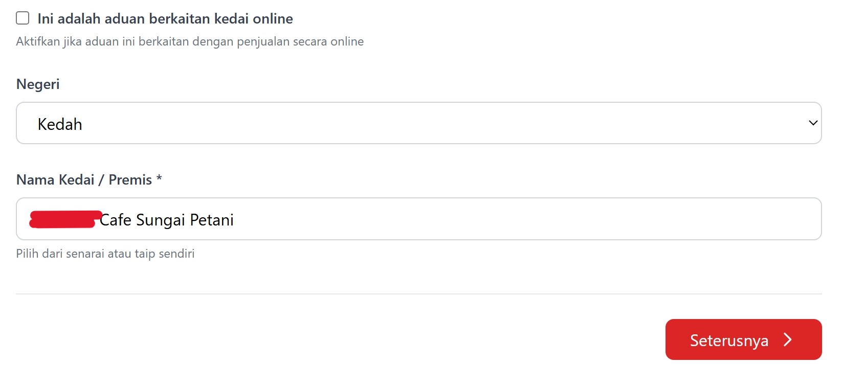 3. Seterusnya, anda menatal ke bawah. Abaikan kotak yang perlu ditanda (kecuali berkaitan). Kemudian, isikan maklumat di dalam ruang kosong Negeri > Nama Kedai / Premis dan klik butang Seterusnya >.