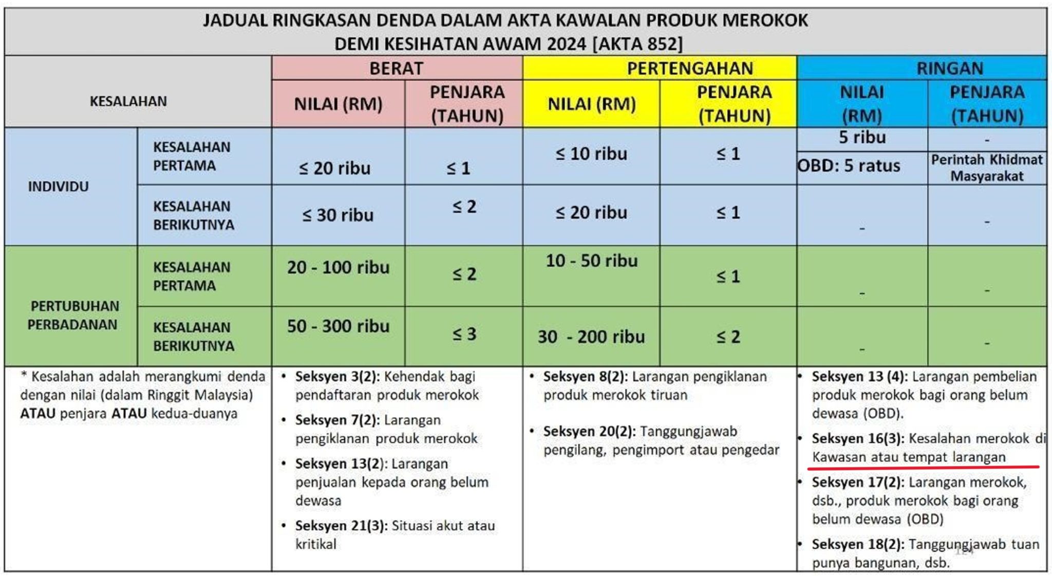 Tahukah juga anda bahawa denda bagi kesalahan merokok di kawansan atau tempat larangan adalah tinggi dan boleh dipenjarakan jika melibatkan kesalahan serius.