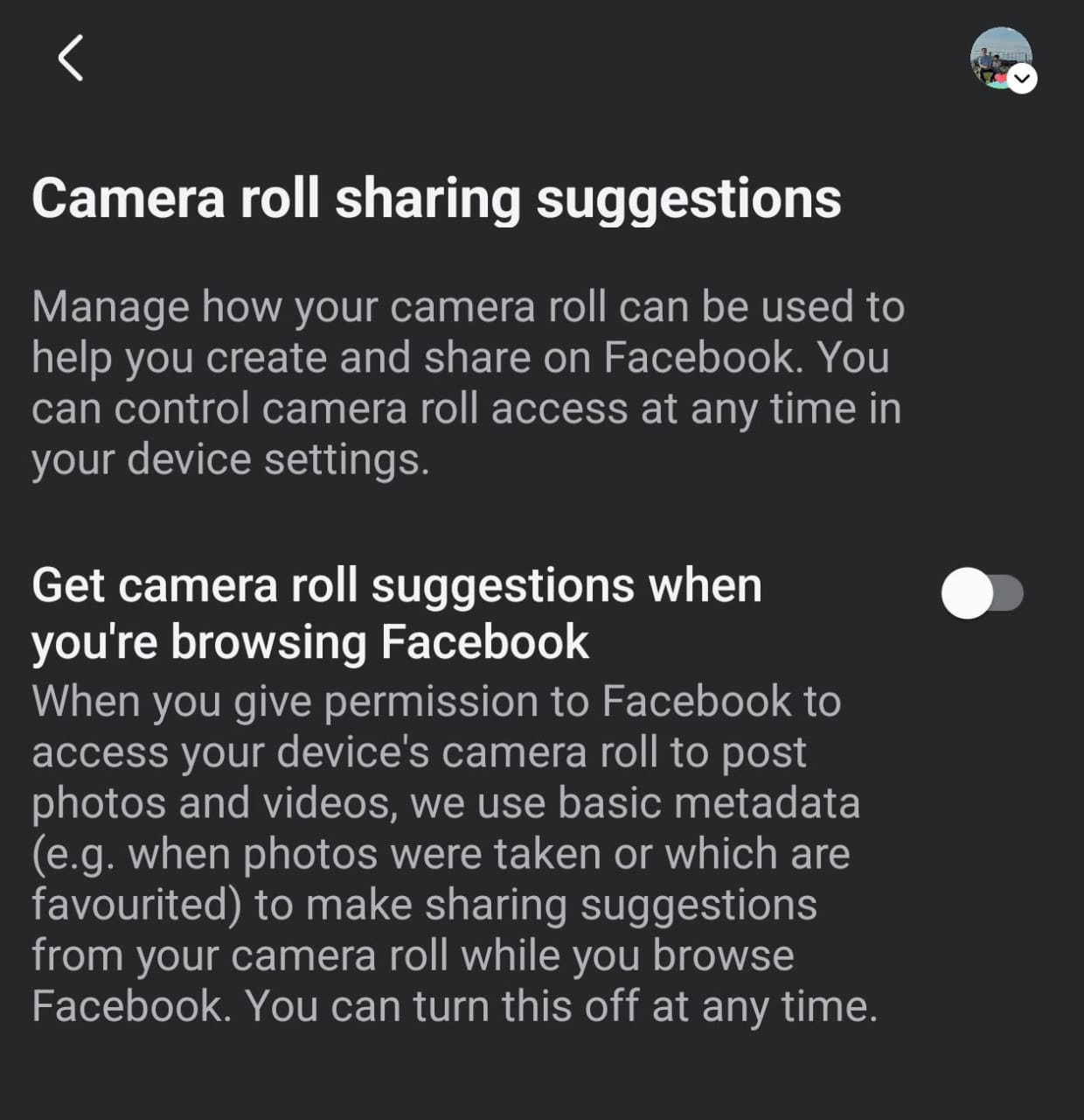- Pastikan tetapan untuk Get camera roll suggestions when you’re browsing Facebook dimatikan.