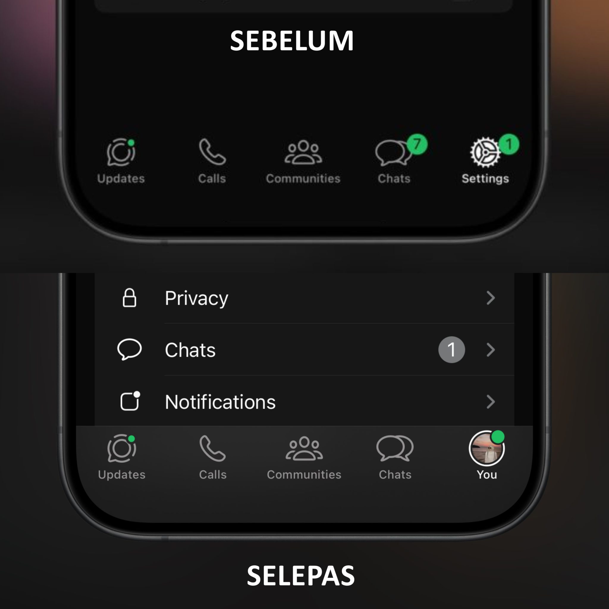 Dalam perkembangan lain, WhatsApp iOS kini menggantikan tab “Settings” kepada “You” yang menampilkan ikon gambar profil.