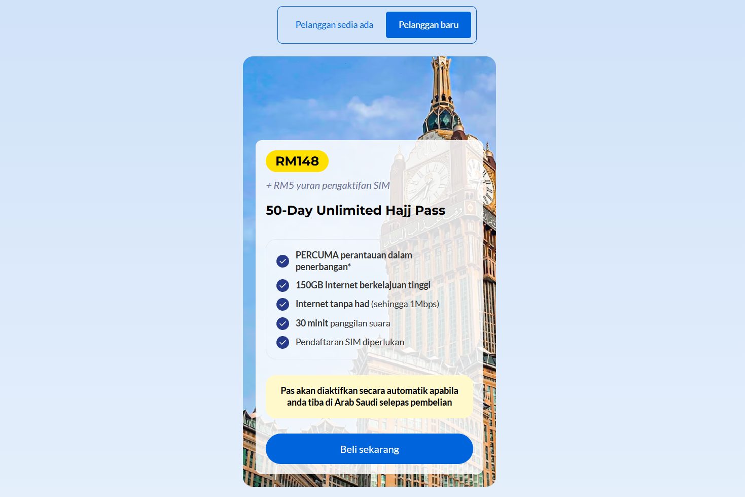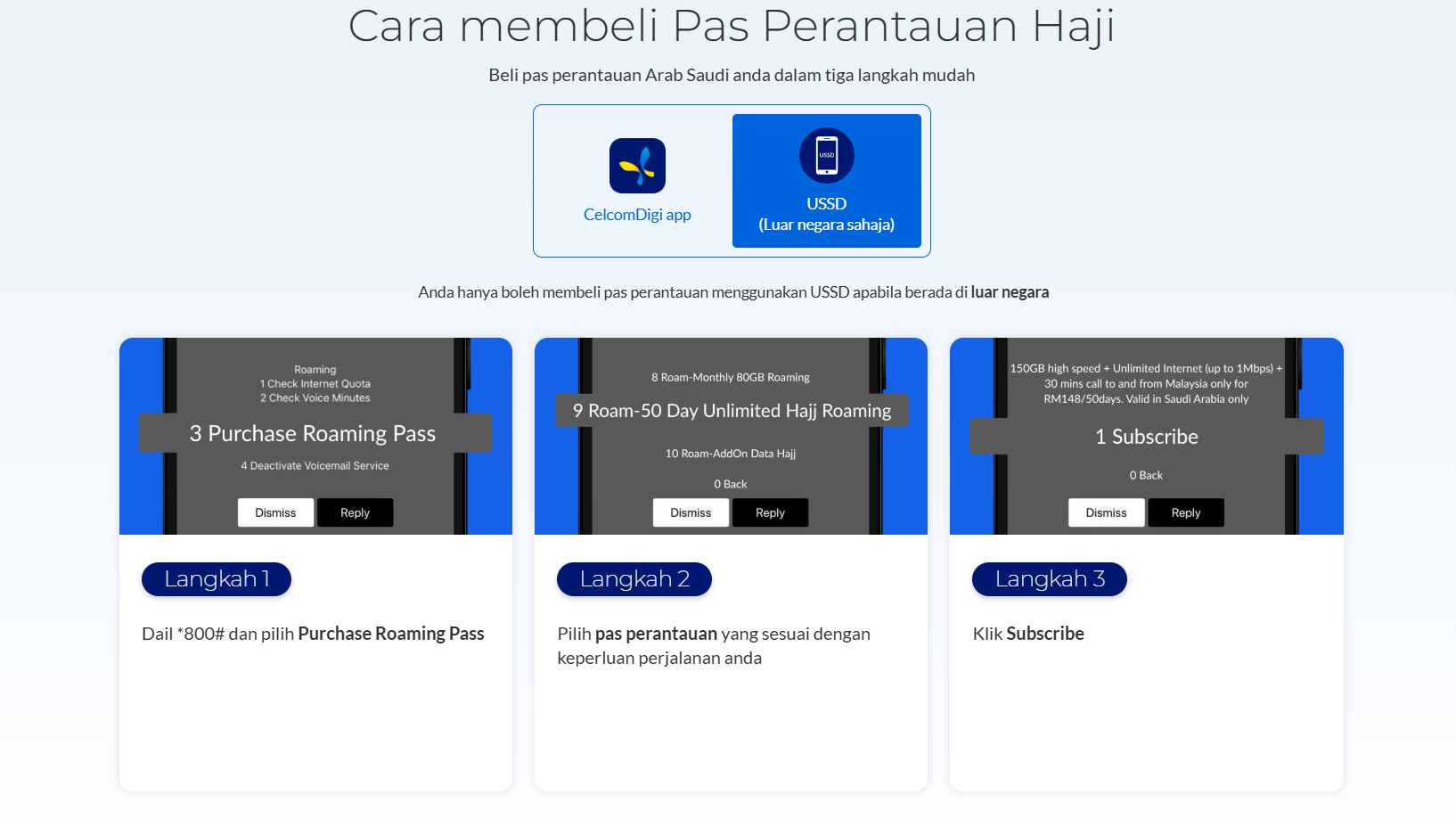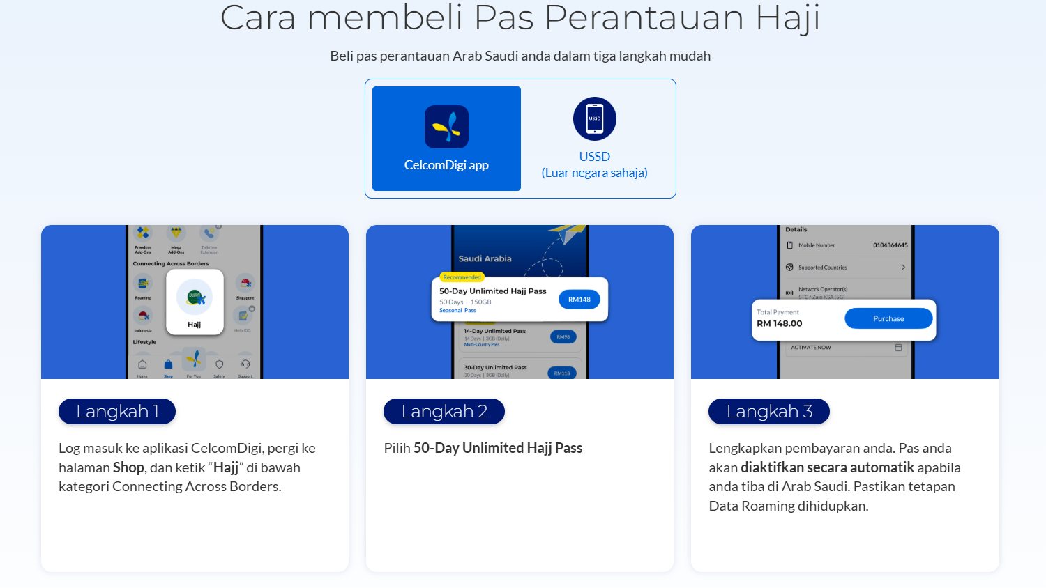 Bagi pengguna sedia ada, pas ini boleh dibeli melalui aplikasi CelcomDigi dengan pergi ke bahagian Shop > Hajj.