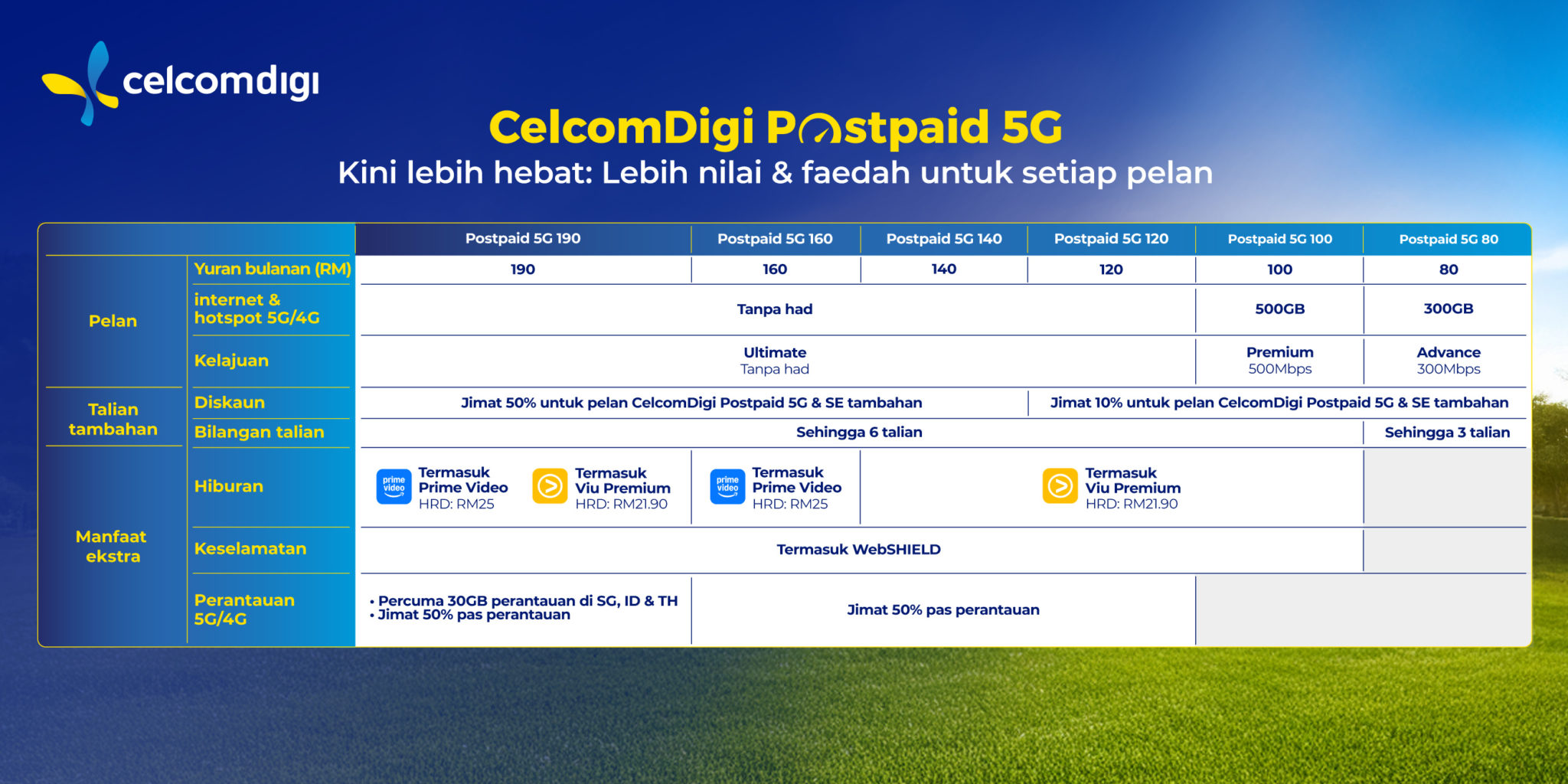 Ciri baharu termasuk akses hiburan Prime Video dan Viu Premium, perlindungan keselamatan WebSHIELD yang ditawar bermula dari pelan Postpaid 5G 100, serta talian tambahan dengan manfaat penuh pada harga diskaun.