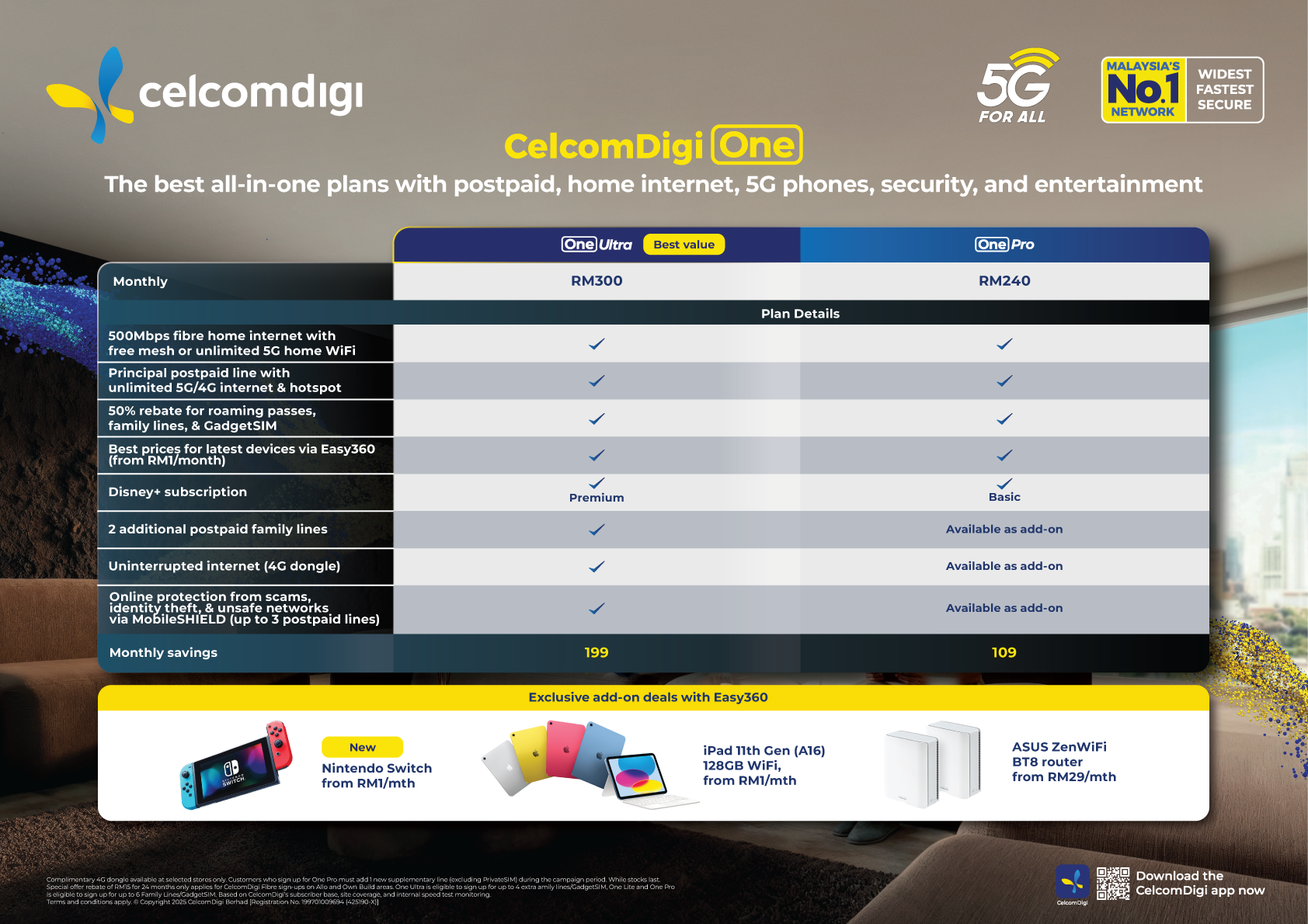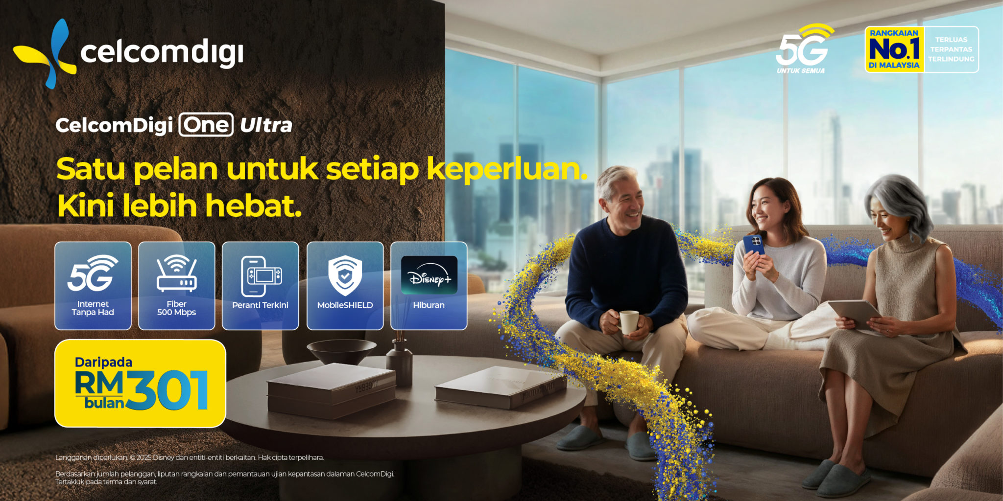 Sementara itu, pelan CelcomDigi ONE Ultra berharga RM301/bulan didatangkan dengan fiber rumah 500Mbps bersama sistem WiFi mesh, tiga talian pascabayar 5G/4G tanpa had yang setiap satunya dilindungi MobileSHIELD, langganan Disney+ Premium serta akses kepada peranti 5G terkini dan produk IoT terpilih, termasuk Nintendo Switch, serendah RM1 sebulan.