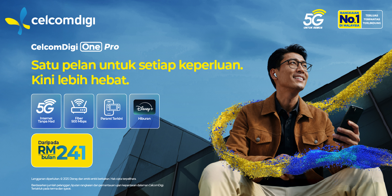 Bermula dari RM241/bulan, pelan CelcomDigi ONE Pro menawarkan kelajuan 500Mbps dengan sistem WiFi mesh, satu talian pascabayar 5G/4G tanpa had dan akses Disney+ Basic.