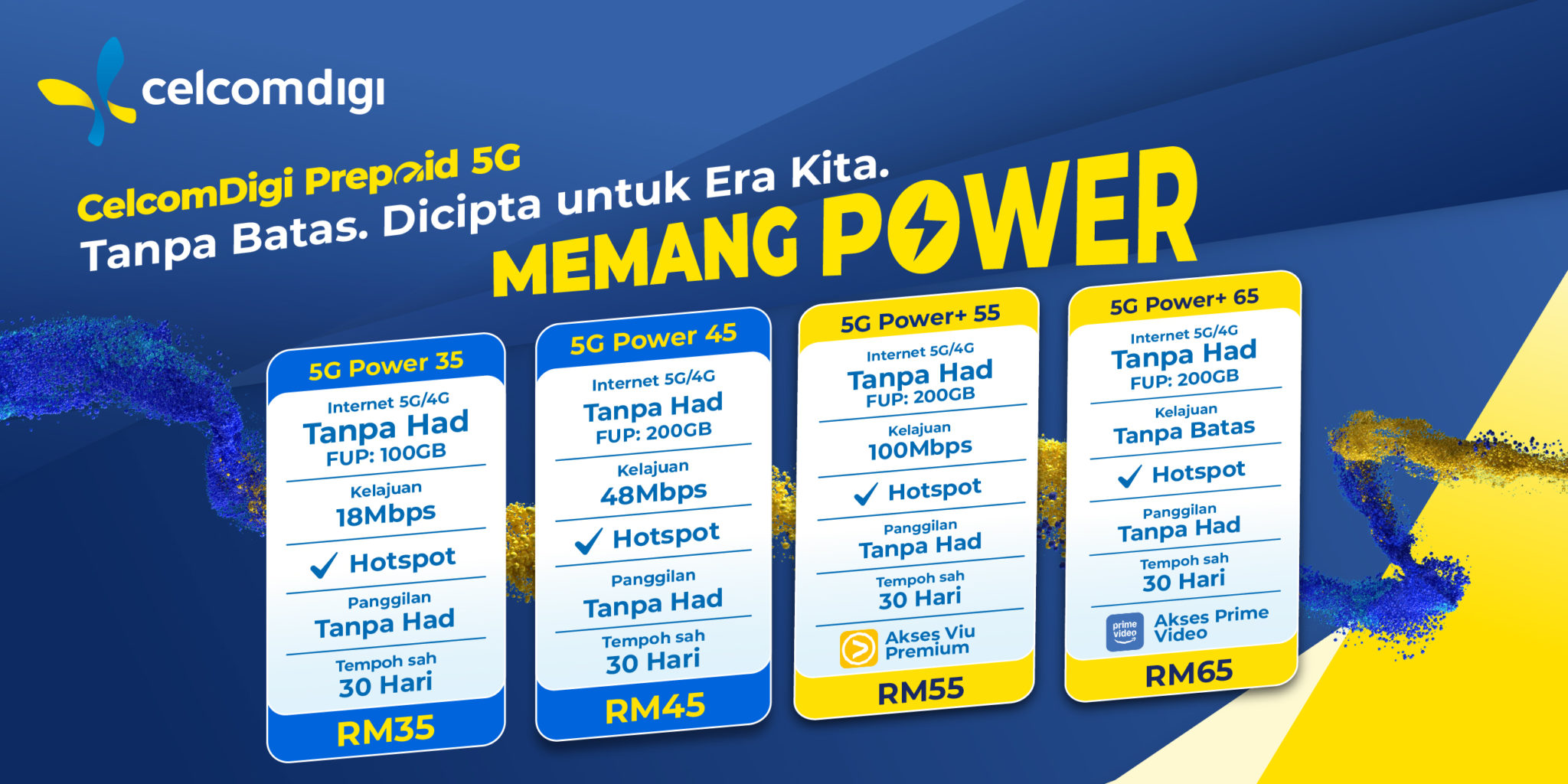 CelcomDigi turut memperkenalkan Prepaid 5G Power+, dengan harga RM55 untuk 5G Power+ 55 dan RM65 bagi 5G Power+ 65. Kedua-duanya menawarkan internet 4G/5G tanpa had (FUP 200GB), tetapi 5G Power+ 55 menyokong kelajuan sehingga 100Mbps manakala 5G Power+ 65 menawarkan kelajuan tanpa batas.