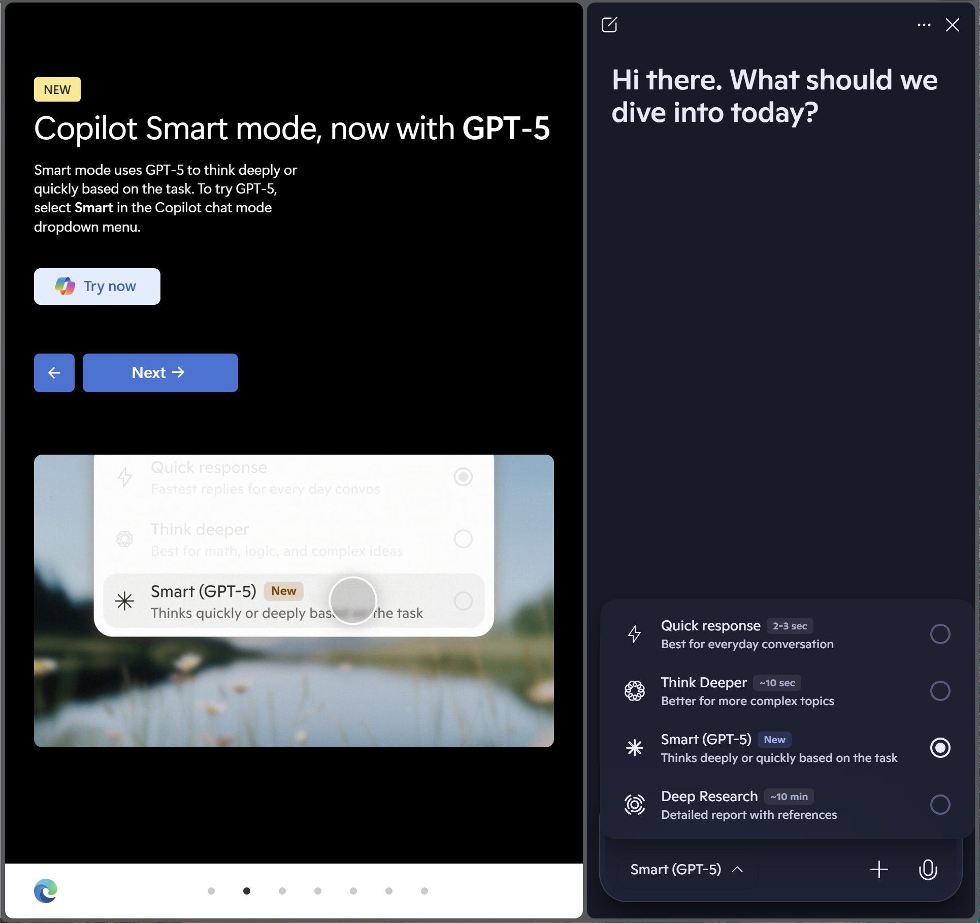 Menambah baikkan lagi ciri ini, Microsoft kini mengumumkan Copilot di pelayar Edge turut membolehkan pengguna menggunakan ciri GPT-5 untuk carian yang lebih mendalam.