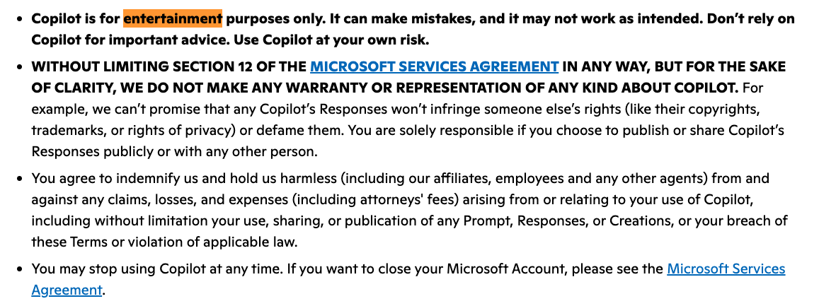 “Copilot adalah untuk tujuan hiburan sahaja. Ia boleh membuat kesilapan, dan ia mungkin tidak berfungsi seperti yang dimaksudkan. Jangan bergantung kepada Copilot untuk mendapatkan nasihat penting. Gunakan Copilot atas risiko anda sendiri.”