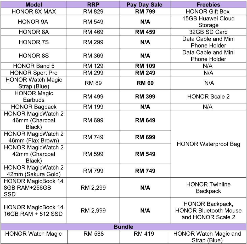 Selain itu, HONOR juga mengadakan Flash Deals dengan diskaun setiap hari pada 12PM semasa HONOR Pay Day Sale ini. Antara produk yang ditawarkan semasa tempoh Flash Sale ini adalah: