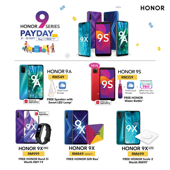 Siri HONOR 9S yang dilancarkan baru-baru ini ditawarkan pada harga RM 359. Manakala HONOR 9X dijual pada harga RM 849 serta percuma HONOR Gift Box mulai 21 hingga 30 September 2020 di HONOR Experience Store.