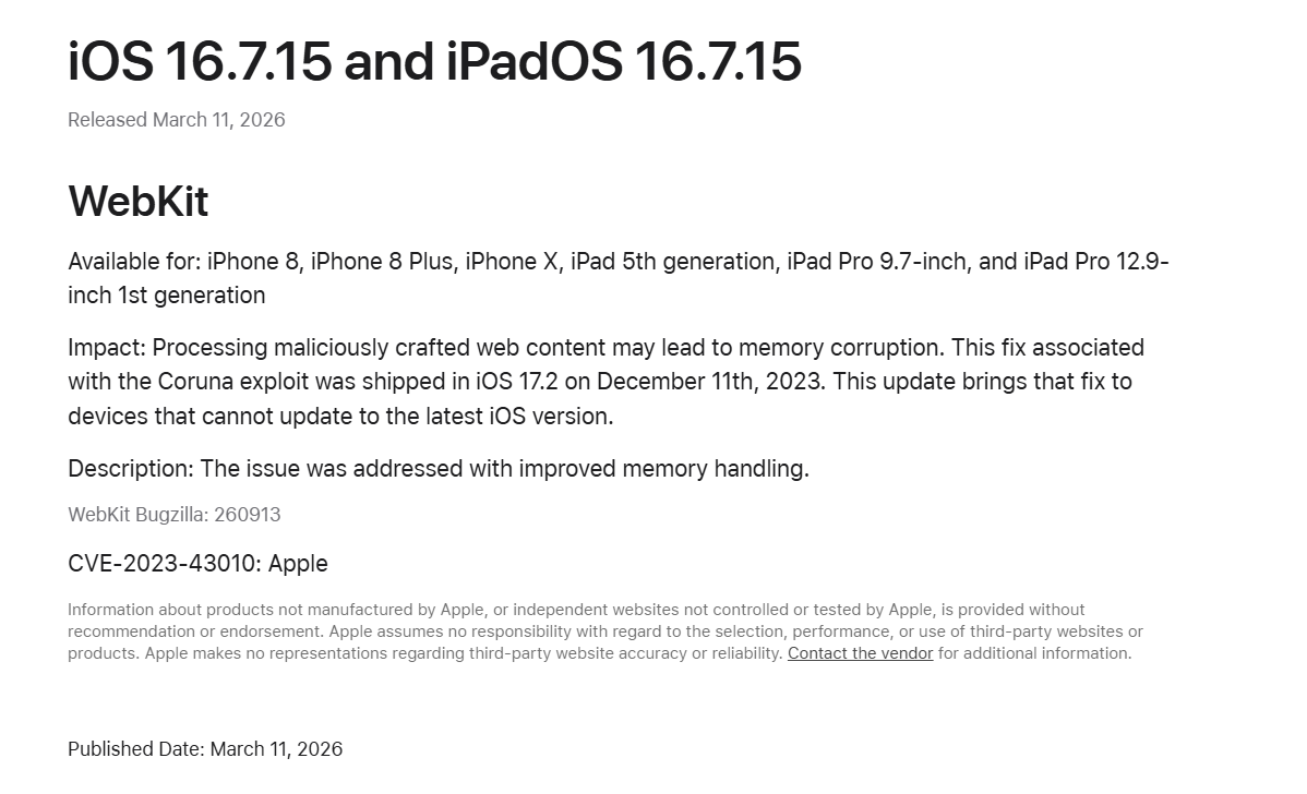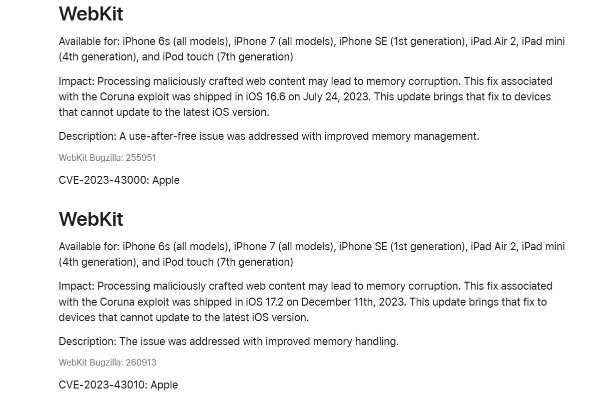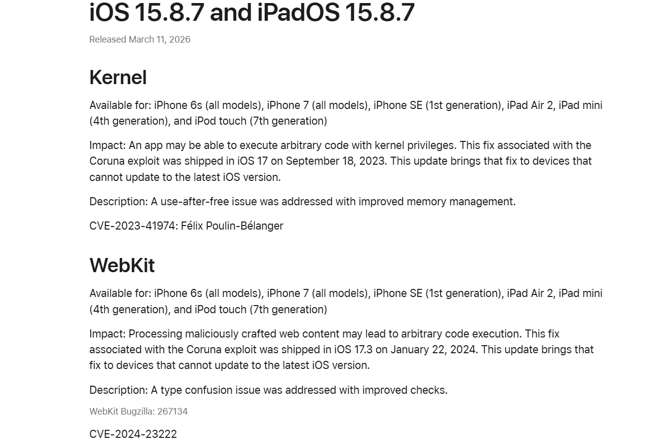 Melalui halaman Security Release, Apple mengesahkan bahawa kemas ini membetulkan kerentanan pada kernel dan WebKit yang berkaitan dengan eksploitasi Coruna, yang didedahkan minggu lalu oleh Google dan iVerify.