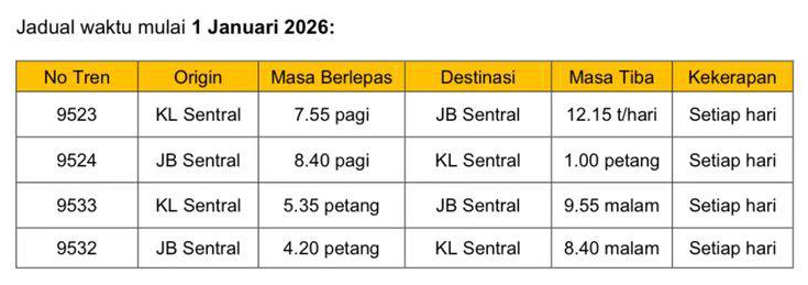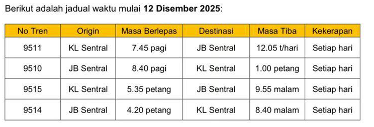 Keretapi Tanah Melayu Berhad (KTMB) hari ini mengumumkan perkhidmatan tren elektrik (ETS) ke JB Sentral akan mula beroperasi pada 12 Disember 2025.