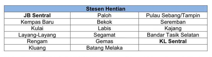 Bagi laluan KL Sentral ke JB Sentral, kadar tambang bermula daripada RM82 sehala, dan pengguna boleh memilih hentian seperti Kulai, Kempas Baru, Layang-Layang serta beberapa stesen lain sepanjang laluan.