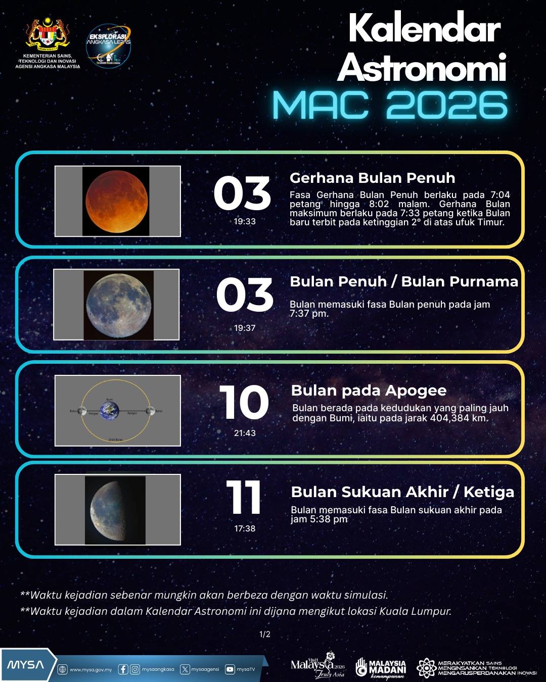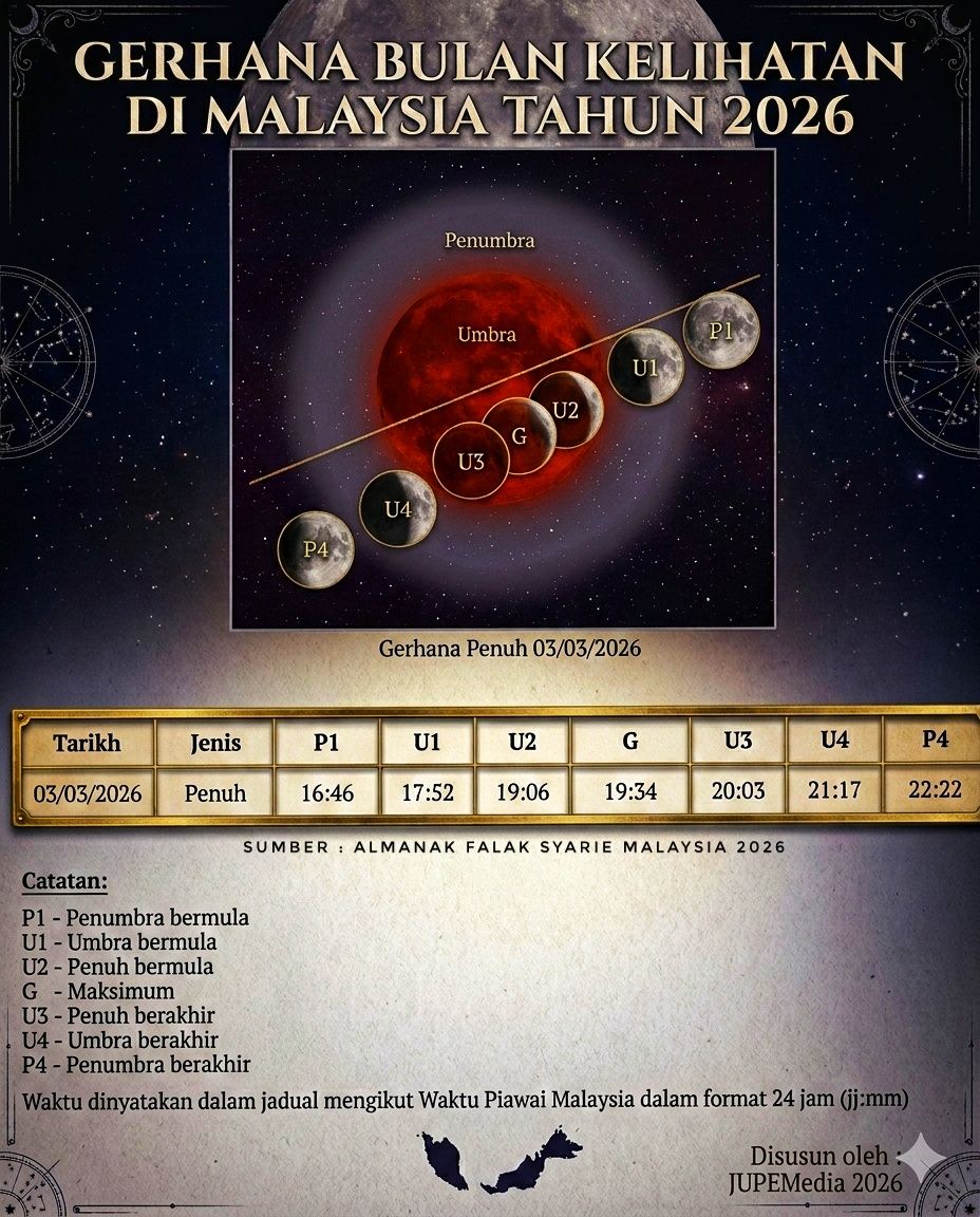 Pada 3 Mac bersamaan dengan malam 14 Ramadan 1447H ini dijangka akan berlakunya fenomena Gerhana Bulan Penuh yang akan dapat disaksikan oleh seluruh rakyat Malaysia.