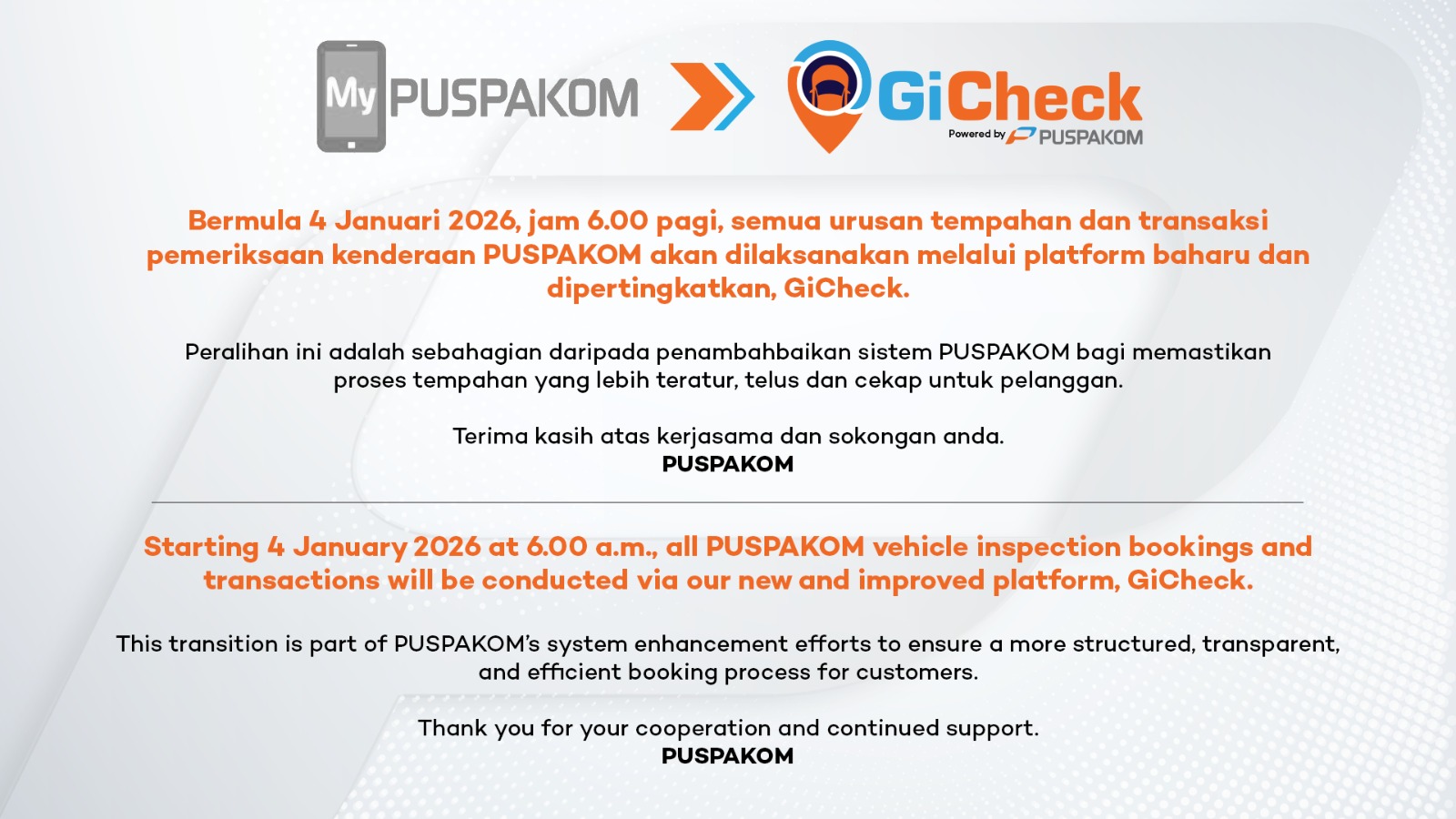 Mula beroperasi sejak 4 Januari 2026, Puspakom memaklumkan peralihan ini merupakan sebahagian daripada penambahbaikan sistem bagi memastikan proses tempahan lebih teratur, telus dan cekap pelanggan.