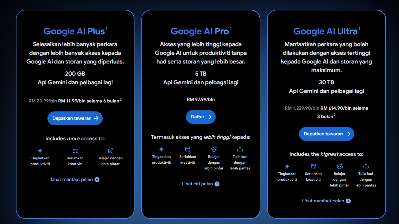 Untuk rujukan, terdapat tiga pelan Google AI yang boleh dilanggan iaitu Google AI Plus (RM23.99/bulan), Google AI Pro dan Google AI Ultra (RM1,229.90/bulan). Manakala pelan storan Google pula ditawarkan dalam empat pilihan: Percuma, Asas, Standard dan Premium.