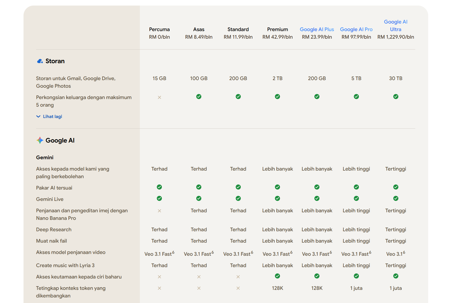 Selain ruang storan, pelan ini turut menawarkan akses kepada Google AI, termasuk aplikasi Gemini dengan had lebih tinggi untuk 3.1 Pro, Flow, NotebookLM, penjanaan video, serta integrasi Gemini dalam Gmail, Docs, Vids dan pelbagai lagi.