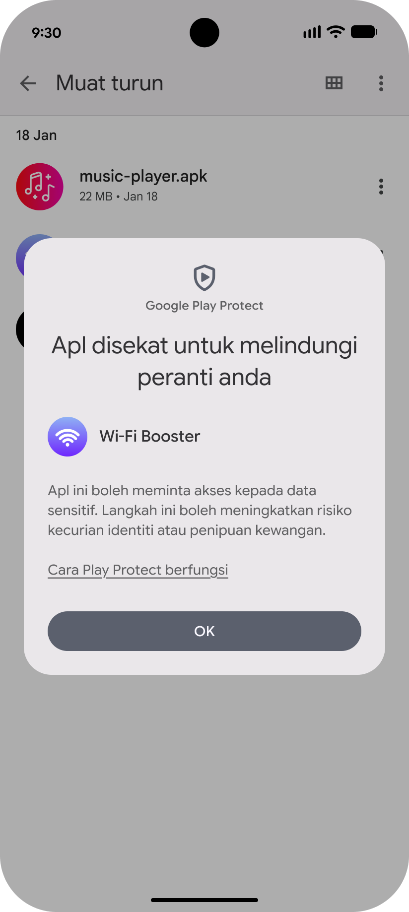 Apabila seseorang pengguna cuba memasang aplikasi daripada sumber luar seperti pelayar web atau aplikasi mesej, Google Play Protect akan melakukan pemeriksaan kebenaran secara masa nyata bagi memantau kebenaran ‘runtime’ yang sering dieksploitasi seperti membaca SMS atau memintas kata laluan sekali guna (OTP).