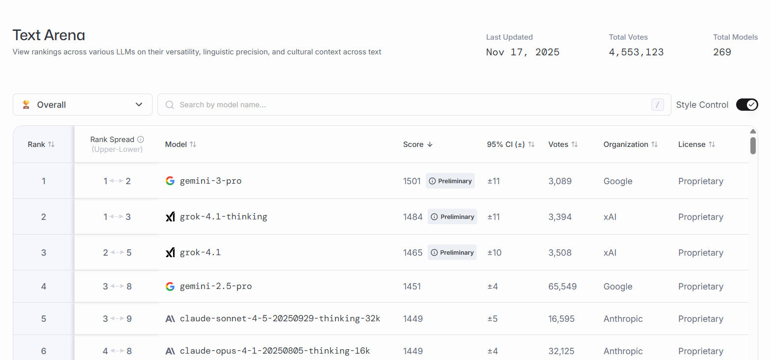 Dari segi prestasi awal, Gemini 3 Pro mencatat skor 1501 Elo di LMArena dan mengatasi 2.5 Pro yang sebelum ini menduduki tempat teratas dengan skor 1451.