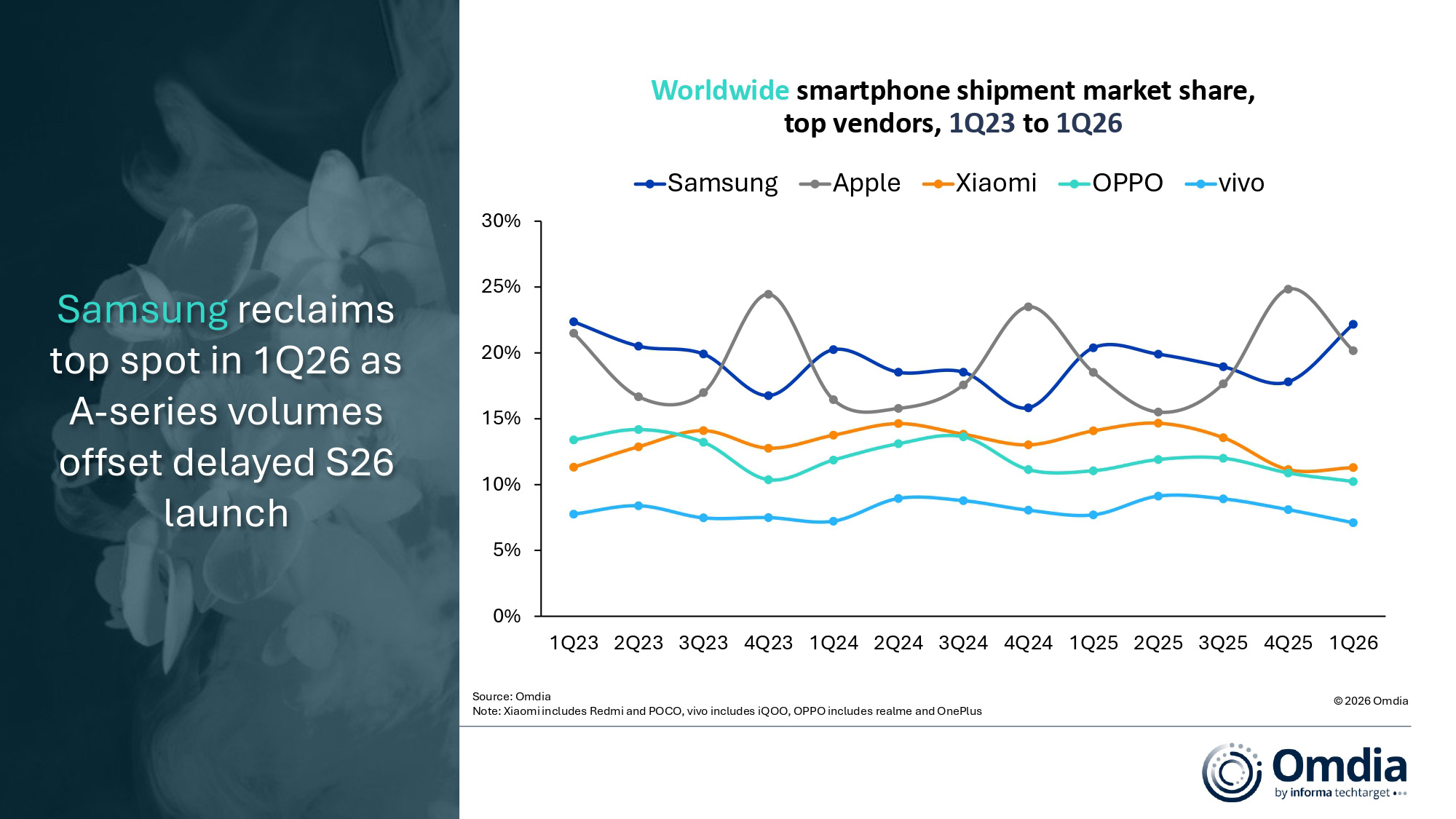 Samsung kembali menduduki tangga teratas dengan 22% pegangan pasaran, didorong oleh permintaan kukuh terhadap siri Galaxy S26.