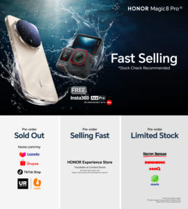 Hanya empat hari selepas pelancaran rasmi, HONOR Magic8 Pro telah laris dijual. Stok terhad di Harvey Norman, Senheng dan Maxis manakala, stok di HONOR Experience Stores juga semakin berkurangan.