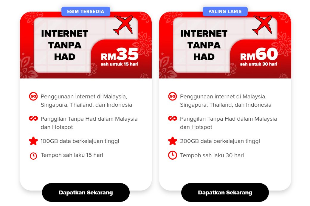 Untuk pelan RM35 dengan tempoh sah 15 hari, pengguna akan menerima 100GB data berkelajuan tinggi. Bagi pelan RM60/30 hari, kuota tersebut meningkat kepada 200GB data berkelajuan tinggi.