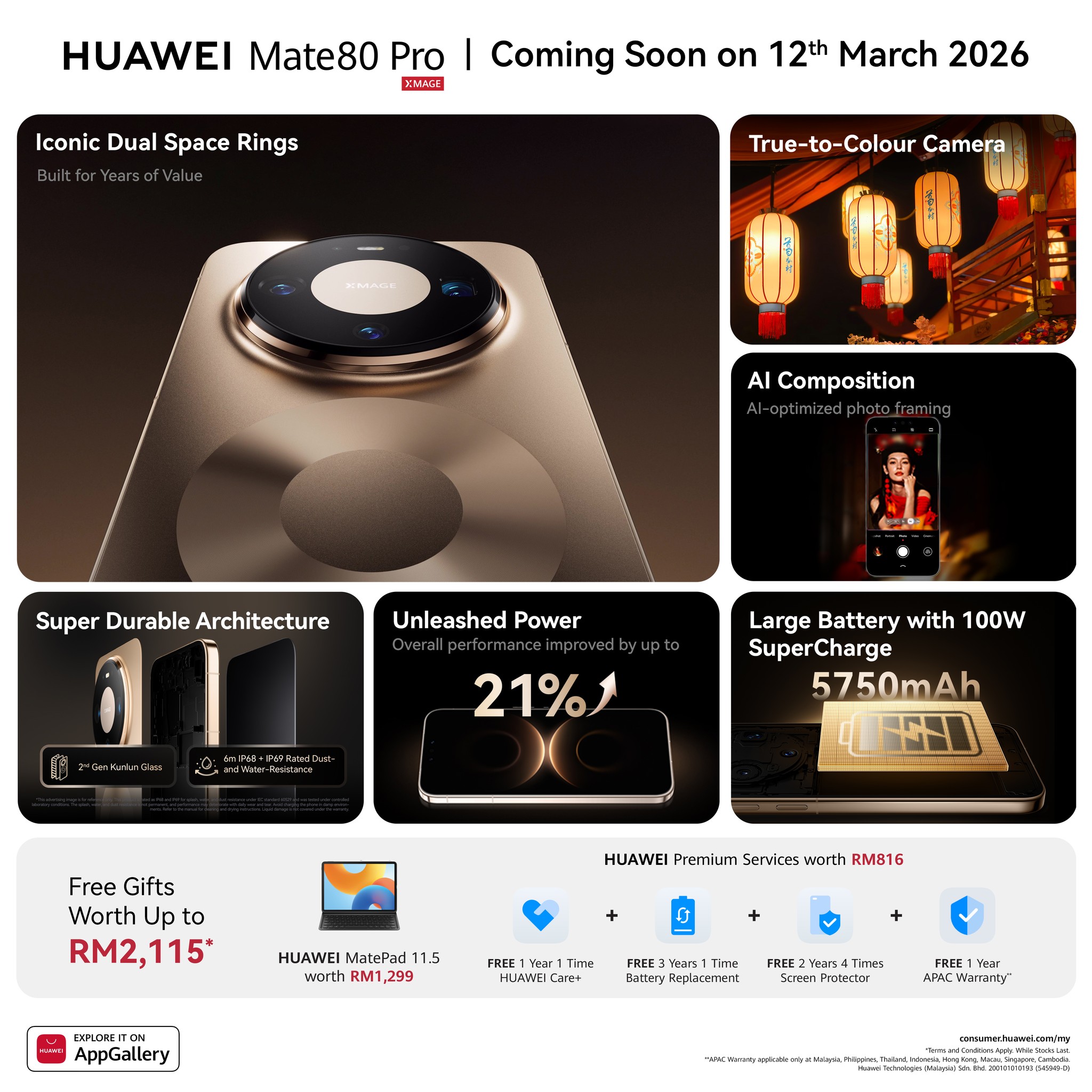 Pelancaran Mate 80 Pro dijadualkan pada 12 Mac 2026 dan akan ditawarkan melalui saluran jualan rasmi Huawei termasuk kedai fizikal dan platform e-dagang seperti Shopee, Lazada dan TikTok Shop. Bagi pembelian awal, Huawei turut menyertakan hadiah percuma bernilai sehingga RM2,115.