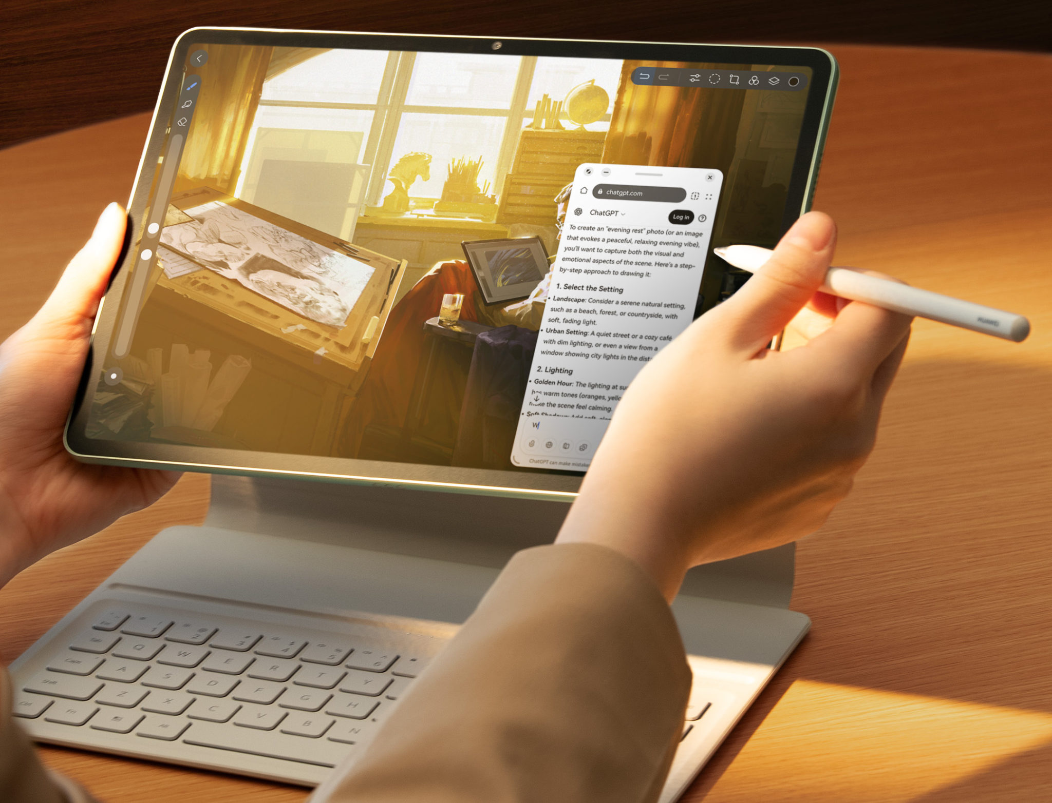 Dari segi produktiviti, tablet ini menyokong aplikasi HUAWEI Notes yang kini dipertingkat dengan ciri AI untuk penambahbaikan tulisan tangan dan pengecaman persamaan matematik. Ia turut menyokong aplikasi kreatif GoPaint, perisian WPS Office gred PC, serta Wondershare Filmora untuk penyuntingan video terus pada peranti. Pengalaman penggunaan dilengkapkan lagi dengan sokongan HUAWEI M-Pencil Pro dan Papan Kekunci Magnetik Pintar HUAWEI.