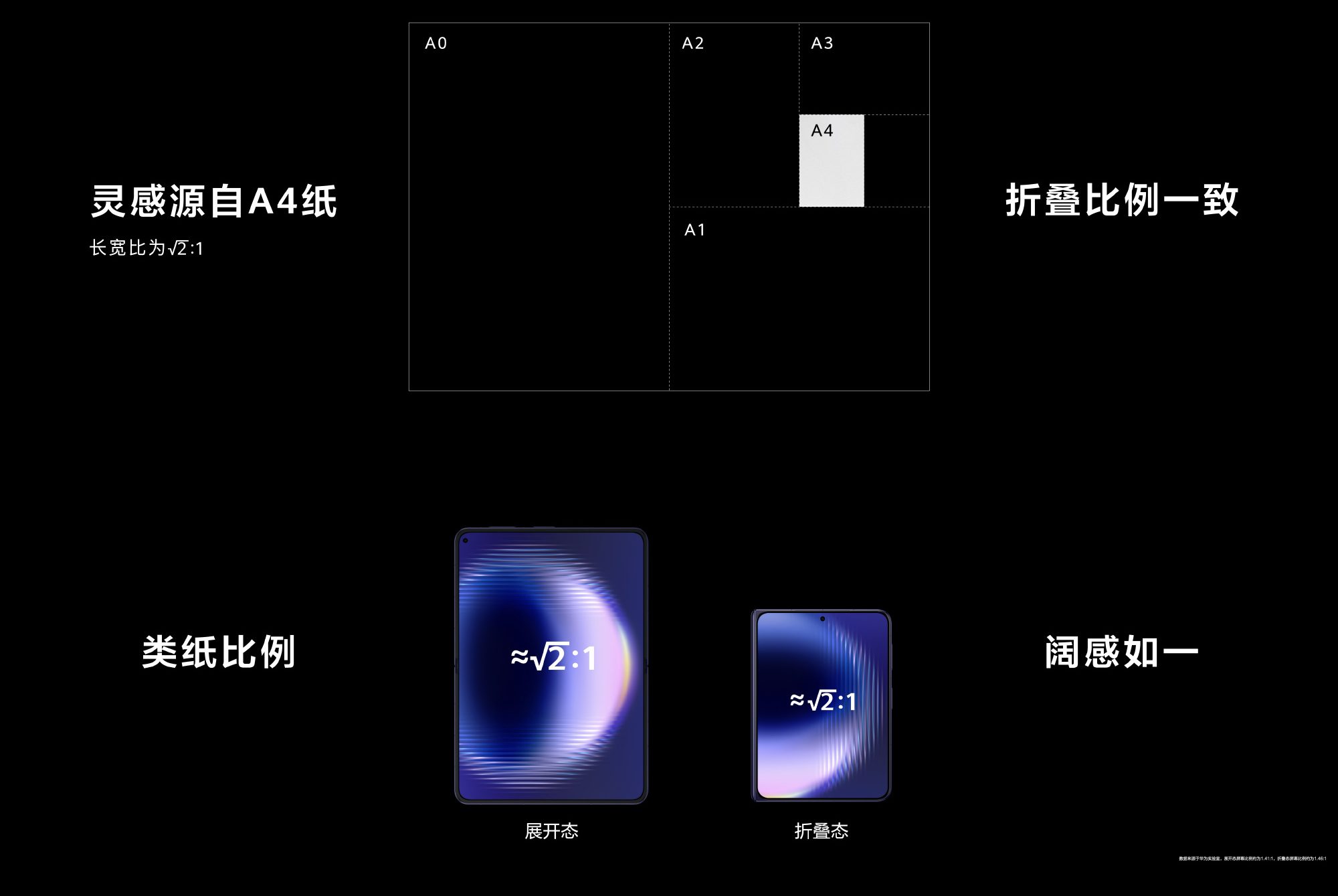 Model ini tampil dengan rekaan yang diinspirasikan daripada kertas A4, menggunakan nisbah skrin √2:1 yang memberikan paparan lebih luas dan seimbang apabila dibuka.